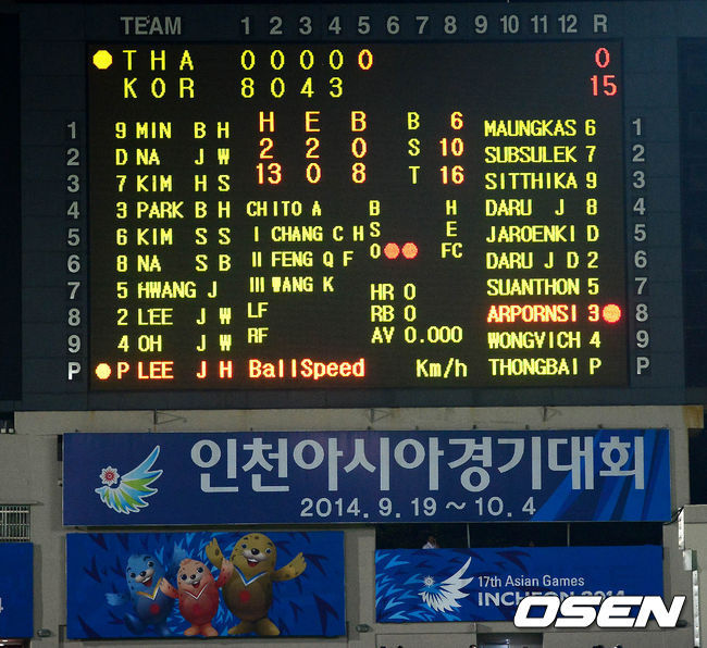 야구는 태국과의 경기서 완승을 거두며 금메달을 향해 쾌조의 스타트를 끊었다. 한국은 22일 문학구장에서 열린 ‘2014 인천 아시안게임 야구’ B조 예선 태국과의 1차전에서 릴레이 등판한 투수들의 무실점 호투와 타선의 폭발력을 앞세워 15-0, 5회 콜드게임 승을 거뒀다. 예상대로 낙승이었다. 애초 목적이었던 투수들의 컨디션 점검도 무사히 끝냈다.