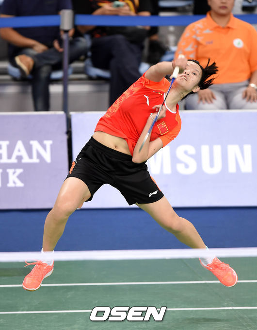 1경기 중국 리 쉐루이가 스매시를 하고 있다.