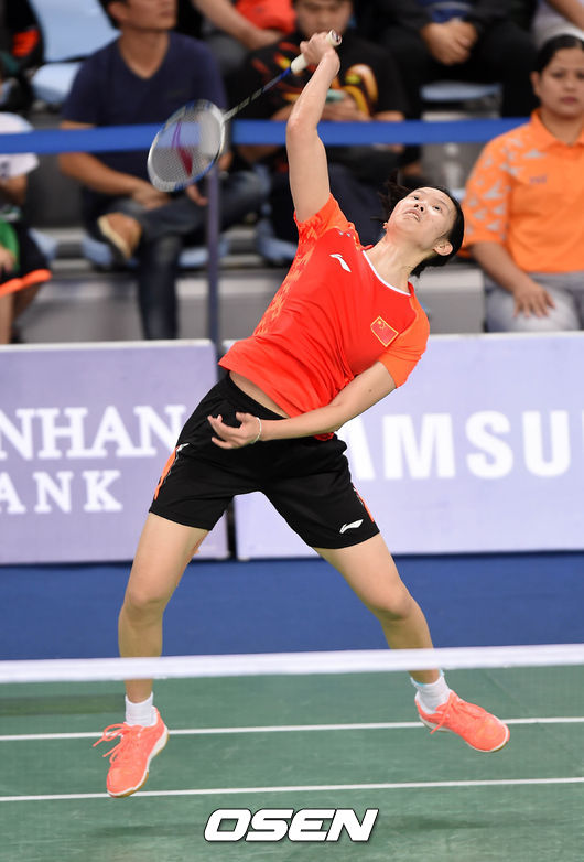 1경기 중국 리 쉐루이가 스매시를 하고 있다.