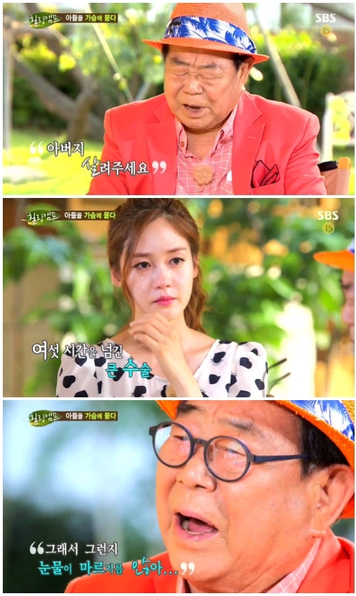 유쾌한 입담을 자랑하던 송해였지만 좀처럼 이야기를 잘 잇지 못했다. 붉어진 눈시울을 연신 닦으며 "연락이 와서 가보니까 병원에 있는 상태였다. 아들이 살려달라고 하는데 그냥 서서 보는 마음이 그랬다. 6시간 수술했다. 깨어나길 1주일을 기다렸다"고 말했다. 그는 "사람이 가진 것이 흙과 물 밖에 없는지 눈물이 자꾸 흐르나 보다. 이제 눈물이 마를 때도 됐는데…"라고 말해 안타까움을 자아냈다.