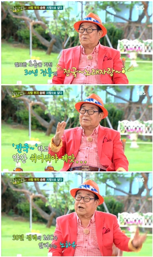 이날 송해는 배우 안성기의 형이자 전 KBS PD인 안인기의 권유로 KBS 1TV '전국노래자랑' MC를 시작했다고 말했다. 송해 특유의 외침에 대해 "'전국노래자랑' 중 '전국'을 말하고 쉬었다가 말하는 것은 내가 만들었다. 30년이 지나도 여전히 긴장된다"고 말했다.