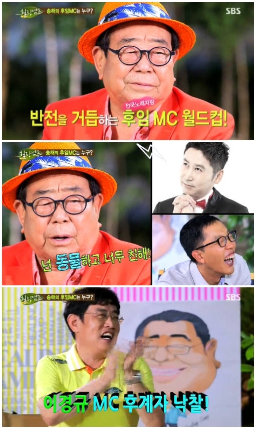 송해는 "프로그램을 쉬겠다는 생각을 해본 적이 없다. 프로그램은 이제 내 일신이 돼버렸다. 이상벽이 간곡하게 부탁했지만 50년 후에 오라고 했다"고 말했다. 이에 MC들은 '후임 MC 월드컵'을 제안했고, 송해는 이경규와 김제동 중에 김제동을, 강호동과 유재석 중 유재석을, 신동엽과 유희열 중 신동엽을 꼽았다. 절친한 후배인 이상벽과 허참 중에서는 한참을 고민한 후 이상벽을 꼽았다. 반전에 반전을 거듭해 이경규가 송해의 선택을 받았다.