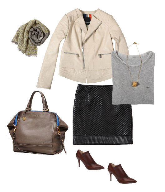 화사한 프린트 보다는 톤이 다운된 컬러 로 전체적인 느낌을 차분하게 유지하고 가을이니만큼 고급스러운 느낌의 래더 자켓과 타이트한 스커트는 도시적인 세련미를 느낄 수 있다.