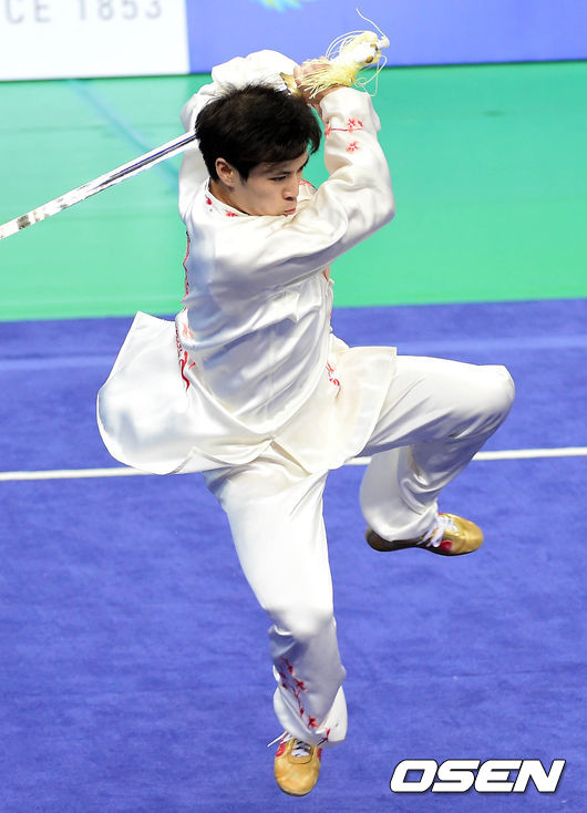 23일 오전 인천 강화군 강화고인돌체육관에서 열린 2014 인천 아시안게임 우슈 남자 태극검 결승에서 김동영이 경기를 펼치고 있다.