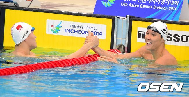 23일 오후 인천 문학박태환수영장에서 열린 '2014 인천 아시안게임' 남자 자유형 400m 예선 1-2위를 차지한 쑨양과 박태환이 악수를 나누고 있다