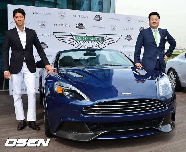 23일 오전 서울 여의도에 있는 서울 마리나에서 애스톤마틴의 국내 시장 진출을 공식적으로 알리는 출시 행사를 열었다. 배우 이동건과 애스톤 마틴 서울 신봉기 대표가 애스톤 마틴 뱅퀴시 볼란테 옆에서 포즈를 취하고 있다.