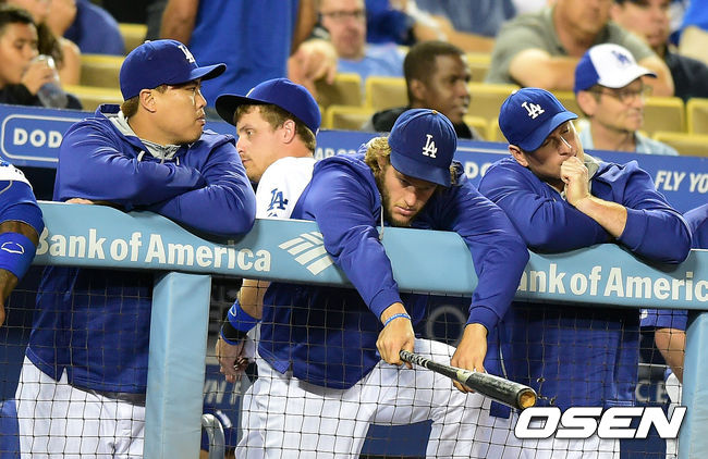 9회말을 마치고 연장에 돌입하며 다저스 류현진과 커쇼, 엘리스가 아쉬워하고 있다../jpnews@osen.co.kr