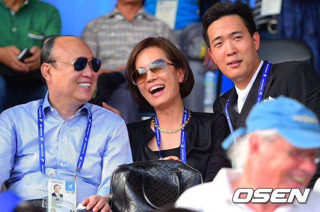 23일 오후 인천 드림파크승마장에서 열린 '2014 인천 아시안게임' 마장마술 개인전 결승에 한화 김승연 회장이 은메달을 딴 아들 김동선을 격려하고 있다