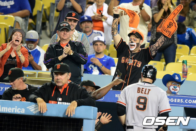 13회초 2사 1,2루에서 샌프란시스코 수잭이 1타점 좌전 적시타를 날리자 팬이 기뻐하고 있다./jpnews@osen.co.kr