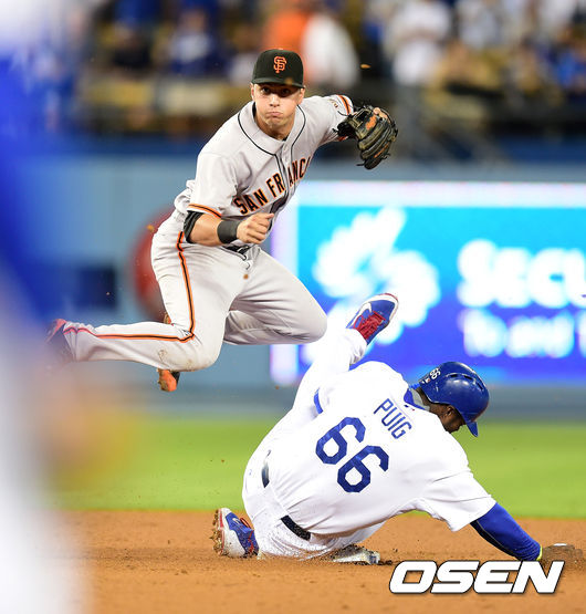 11회말 1사 1루에서 다저스 맷 켐프의 유격수 땅볼에 샌프란시스코 조 패닉이 다저스 푸이그를 포스아웃시키고 1루로 송구하고 있다./jpnews@osen.co.kr