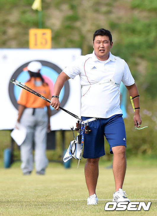 한국 오진혁이 점수를 확인하고 자리로 돌아가고 있다.