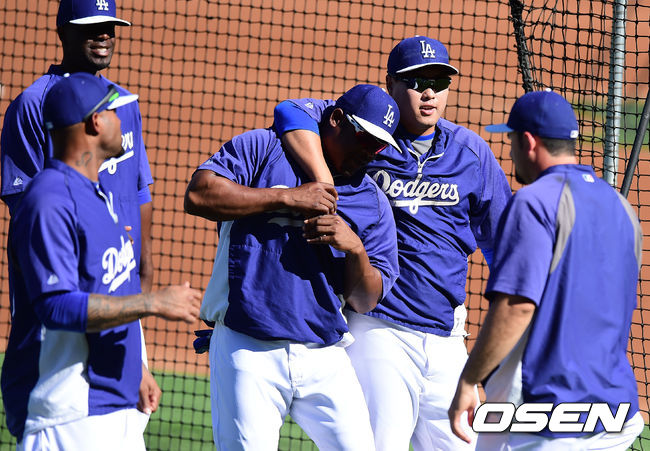 경기에 앞서 다저스 류현진이 유리베와 몸을 풀며 장난을 치고 있다./jpnews@osen.co.kr