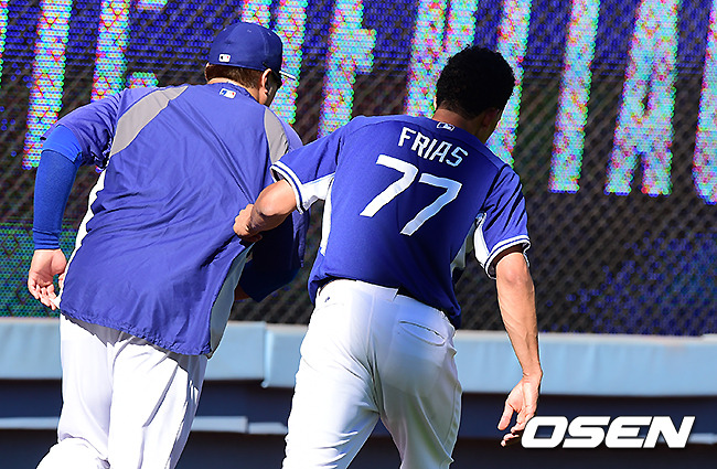경기에 앞서 다저스 류현진이 러닝을 하자 프리아스가 함께 뛰자며 옷을 잡아채고 있다./jpnews@osen.co.kr