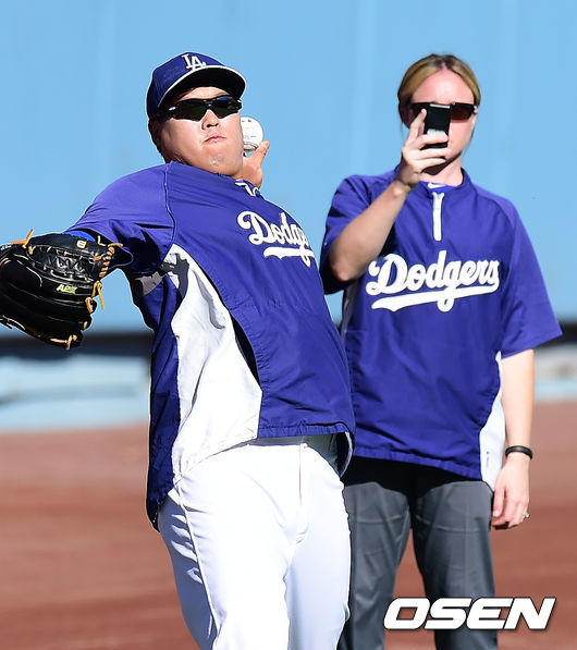 경기에 앞서 다저스 류현진이 캐치볼을 하며 재활과정을 소화하고 있다./jpnews@osen.co.kr