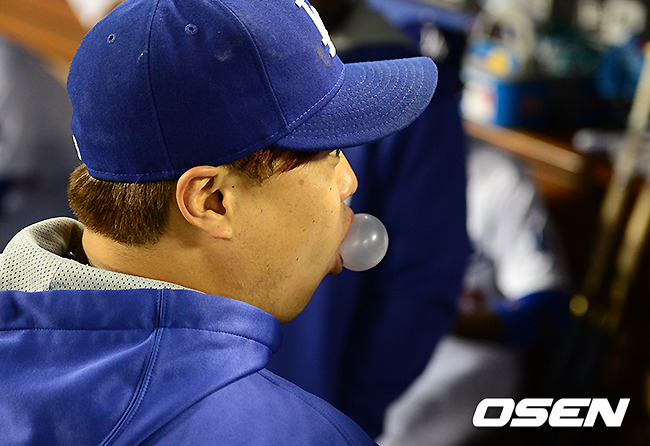 경기에 앞서 다저스 류현진이 더그아웃에서 유리베와 이야기를 나누며 즐거운 표정을 짓고 있다./jpnews@osen.co.kr
