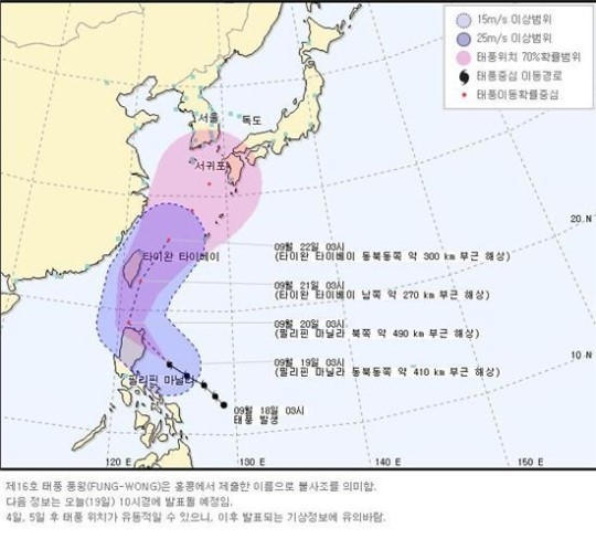 한반도가 태풍 풍웡 간접 영향권에 진입할 것으로 전망된다. 강한 비바람이 내릴 것으로 예보됐다. 기상청은 23일 "전국이 동해북부해상에 위치한 고기압의 영향을 받다가 점차 북상하는 제16호 태풍 풍웡 간접 영향을 받겠다"고 예보했다. 예보에 따르면 태풍 풍웡의 간접 영향에 따라 전국이 대체로 맑다가 차차 흐려져 낮에 전남 해안부터 비가 시작될 것으로 보인다. 늦은 오후에는 충청이남지방, 늦은 밤에는 경기북부와 강원중북부를 제외한 전국으로 비가 확대될 전망. 내일까지 매우 강한 바람과 시간당 30mm 이상의 강한 비가 내릴 예정이다. 수증기가 유입되고 지형적인 효과가 더해지는 해안과 지리산 부근에는 150mm 이상, 제주도산간에는 200mm 이상의 매우 많은 비가 내리는 곳도 있을 것으로 보인다. 한편, 태풍 풍웡 간접 영향 소식을 접한 누리꾼들은 "태풍 풍웡 간접 영향, 내일 비 많이 온다던대" "태풍 풍웡 간접 영향. 필리핑 태풍 이어 한국이네" "태풍 풍웡 간접 영향, 중국서 약화됐으면 좋겠다" 등의 반응을 보였다. OSEN 기상청.