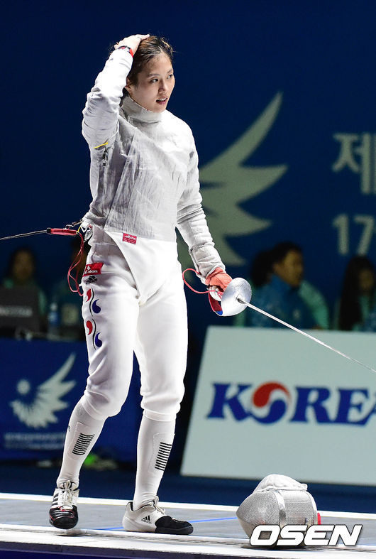 김지연은 위기의 순간 빛났다. 한국은 초반 중국의 거침 없는 기세에 적잖이 당황했다. 한 때 14-20까지 크게 뒤졌다. 김지연이 구세주로 떠올랐다. 22-25로 뒤진 채 피스트에 오른 김지연은 위신팅을 맞아 3점을 내주며 8점을 뽑아냈다. 30-28로 한국에 첫 리드를 안겼다.