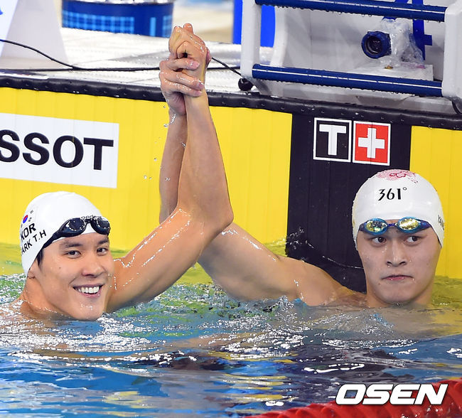 쑨양 팔 들어보이는 박태환,'쑨양! 네가 최고야'
