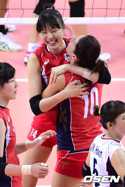 23일 오후 인천 송림체육관에서 열린 2014 인천 아시안게임 배구 여자 예선 A조 2차전 한국과 태국의 경기 2세트 한국이 득점하자 김연경과 양효진이 포옹을 하고 있다.