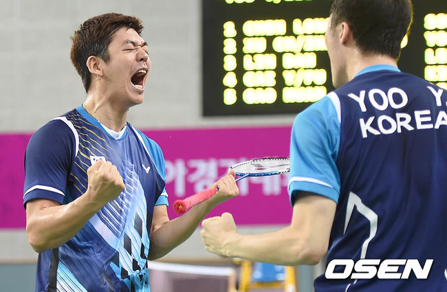 2경기 1세트에 승리한 이용대, 유영성이 환호하고 있다.