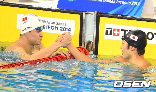 23일 오후 인천 문학박태환수영장에서 열린 2014 인천아시안게임 남자 자유형 400m 결승에서 쑨양이 은메달을 차지한 하기노와 하이파이브를 하고 있다.