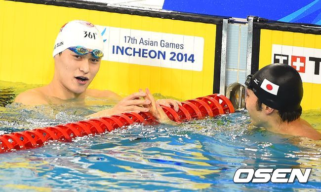23일 오후 인천 문학박태환수영장에서 열린 2014 인천아시안게임 남자 자유형 400m 결승에서 금메달을 딴 쑨양이 은메달 하기노와 이야기를 나누고 있다