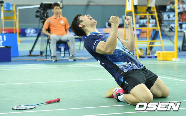 2경기 2세트에서 승리한 이용대, 유영성이 환호하고 있다.