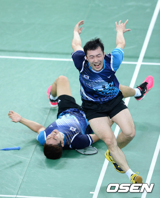 2경기에서 승리한 한국 이용대와 유연성이 환호하고 있다.