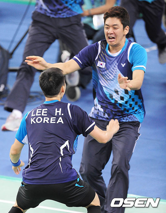 한국 남자 배드민턴 대표팀은 23일 오후 인천 계양체육관에서 개최된 2014 인천 아시안게임 배드민턴 남자 단체전에서 중국을 상대로 5경기 마지막까지 가는 5시간 대접전 끝에 3-2로 짜릿한 승리를 거뒀다. 이로써 한국은 1986년 서울 아시안게임과 2002년 부산 아시안게임 금메달에 이어 12년 만에 남자 단체전 정상을 밟았다.
