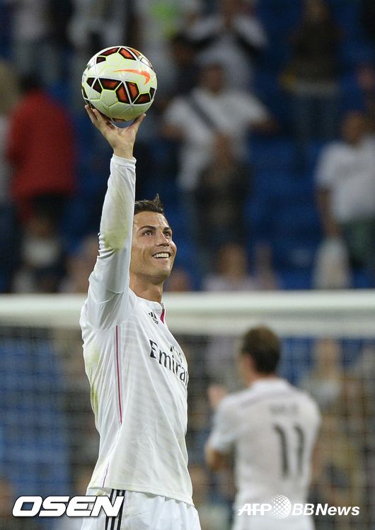 레알 마드리드는 24일(한국시간) 스페인 마드리드 산티아고 베르나베우에서 열린 2014-2015시즌 스페인 프리메라리가 5라운드 엘체와 경기에서 5-1 대승을 거뒀다. 호날두는 이날 홀로 4골을 몰아치며 자신의 파괴력을 새삼 증명했다.