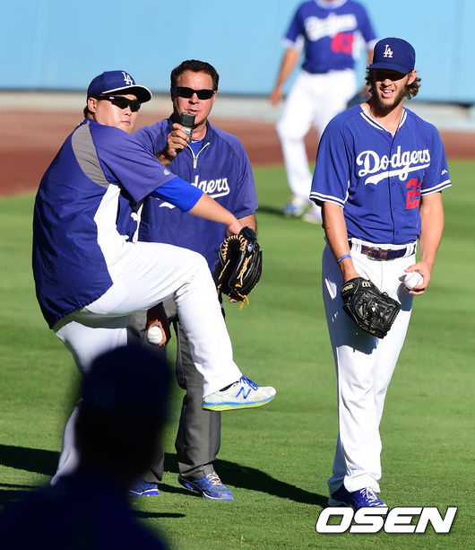 경기에 앞서 다저스 류현진이 팀훈련에 합류, 커쇼가 외야에서 롱토스를 하는 류현진을 지켜보고 있다.