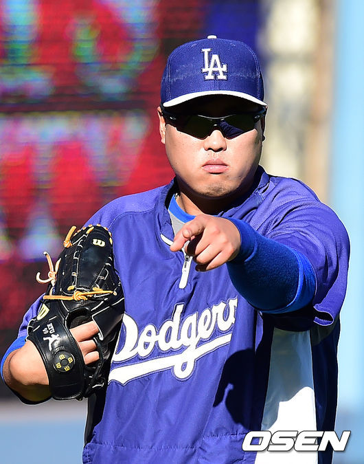 경기에 앞서 다저스 류현진이 팀훈련에 합류, 외야에서 롱토스를 하며 불펜포수에 사인을 보내고 있다.