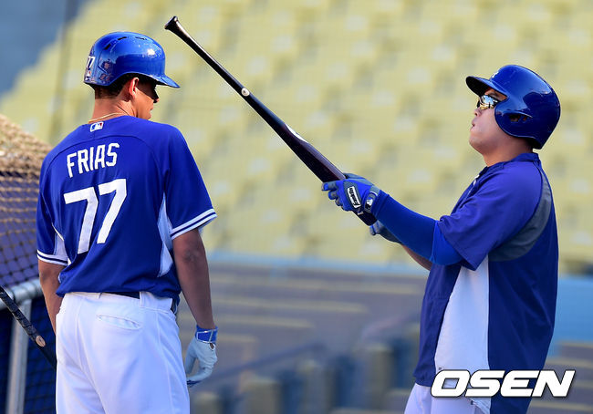 경기에 앞서 다저스 류현진이 팀훈련에 합류, 타격 훈련을 하며 프리아스와 장난을 치고 있다.