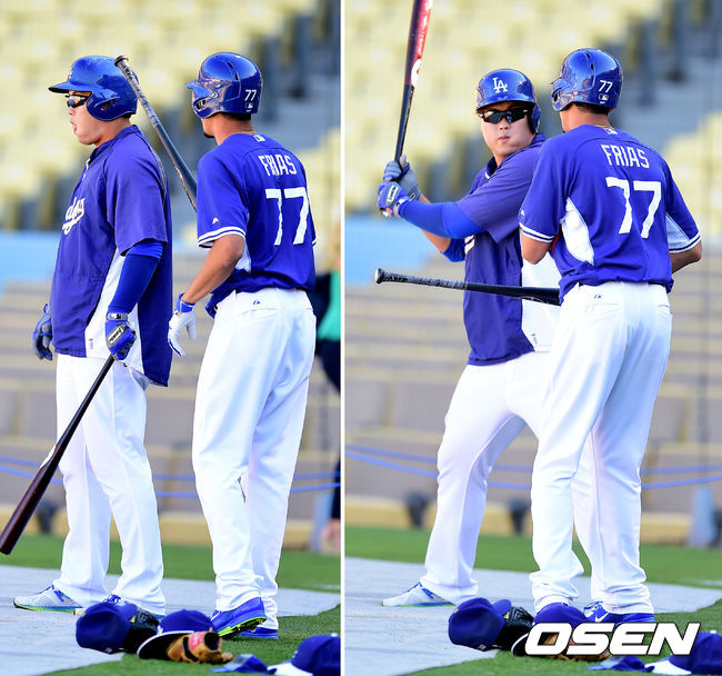 경기에 앞서 다저스 류현진이 팀훈련에 합류, 타격 훈련을 하며 프리아스와 장난을 치고 있다.