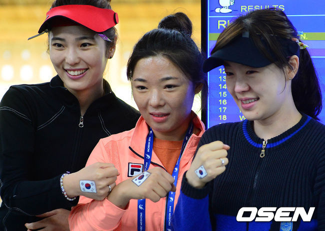 24일 오전 인천 옥련국제사격장에서 열린 2014 인천 아시안게임 사격 여자 50m 소총복사 단체전에서 정미라, 음빛나, 나윤경이 포즈를 취하고 있다.