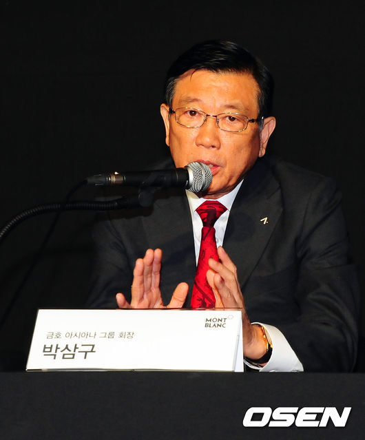 박삼구 금호아시아나 회장이 2014 몽블랑 문화예술후원자상을 수상하고 기자들의 질문에 답하고 있다.
