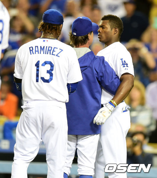1회말 무사에서 다저스 푸이그가 샌프란시스코 범가너의 사구에 흥분하며 벤치클리어링이 일어났다. 매팅리 감독이 푸이그를 말리고 있다.