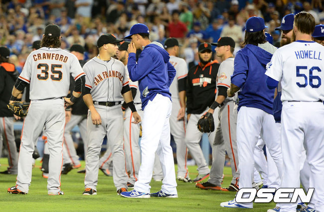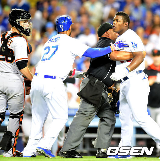 [OSEN=다저스타디움(LA 미국 캘리포니아주), 박승현 특파원]24일(이하 한국시간) 다저스타디움에서 열린 내셔널리그 서부지구 라이벌 LA 다저스와 샌프란시스코 자이언츠전 도중 양팀 선수들이 덕아웃을 비우는 벤치 클리어링이 있었다. 다저스 외야수 야시엘 푸이그와 샌프란시스코 좌완 선발 매디슨 범가너간의 묵은 감정도 도화선 노릇을 한 장면이었다.