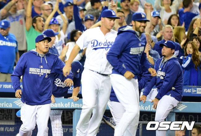 경기후 다저스 류현진을 비롯한 선수들이 승리를 기뻐하고 있다. /jpnews@osen.co.kr