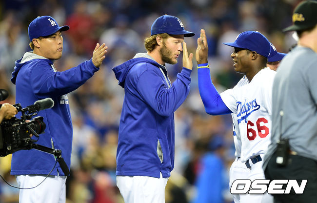 경기후 다저스 류현진과 커쇼가 푸이그와 승리를 기뻐하고 있다. /jpnews@osen.co.kr