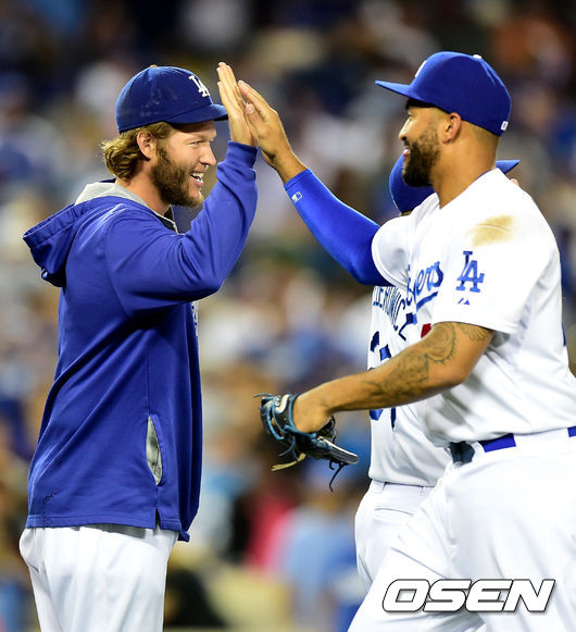 경기후 다저스 커쇼가 맷 켐프와 승리를 기뻐하고 있다. /jpnews@osen.co.kr