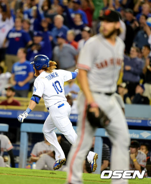 8회말 1사에서 다저스 터너가 샌프란시스코 범가너를 상대로 솔로포를 날리고 있다. 터너는 1회 선두타자 홈런을 날리기도 했다. /jpnews@osen.co.kr