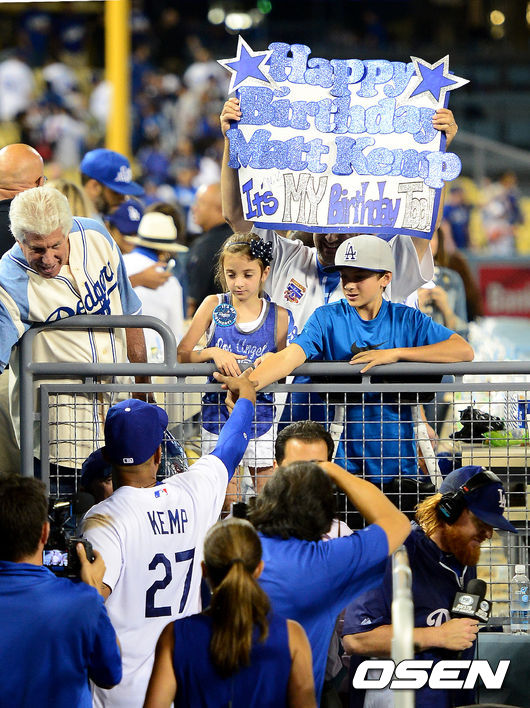 경기후 맷 켐프가 팬들과 악수를 하며 승리를 기뻐하고 있다. /jpnews@osen.co.kr