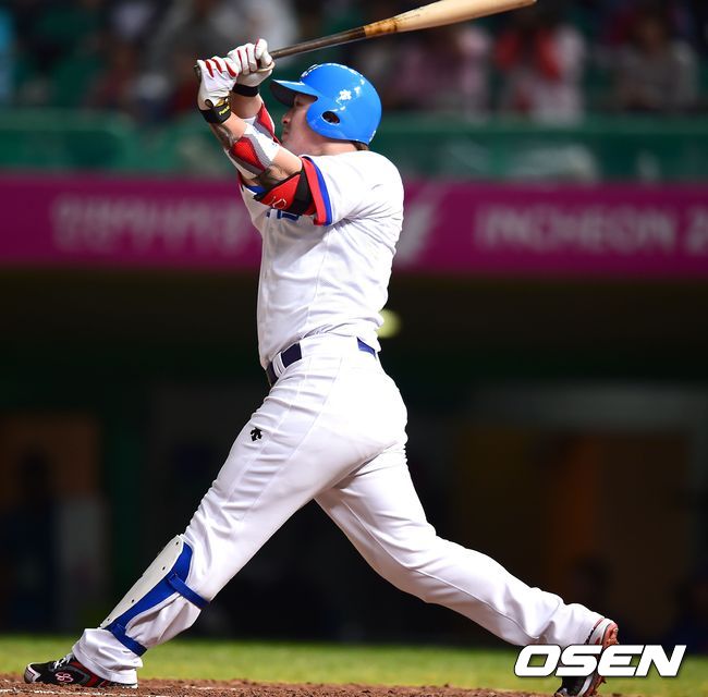 24일 문학야구장에서 2014 인천 아시안게임 B조 예선 2차전 한국과 대만의 경기, 2회말 1사 박병호가 솔로홈런을 날리고 있다