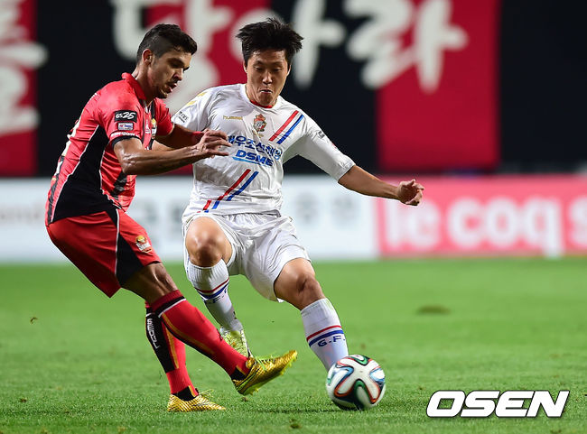 24일 오후 서울월드컵경기장에서 열린 '현대오일뱅크 K리그 클래식 2014' FC 서울과 경남 FC의 경기 전반, 경남 김준엽이 서울 에벨톤의 공을 뺏어내고 있다.