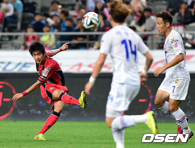 24일 오후 서울월드컵경기장에서 열린 '현대오일뱅크 K리그 클래식 2014' FC 서울과 경남 FC의 경기 전반, 서울 이상협이 슈팅을 시도하고 있다.