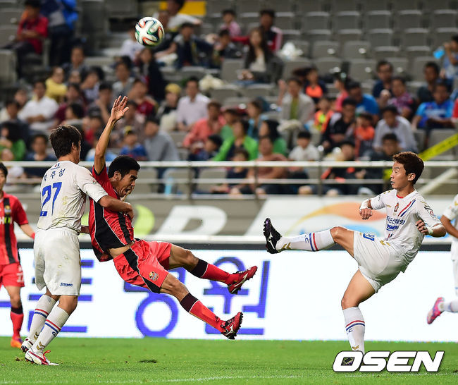 24일 오후 서울월드컵경기장에서 열린 '현대오일뱅크 K리그 클래식 2014' FC 서울과 경남 FC의 경기 전반, 서울 박희성이 넘어지고 있다.