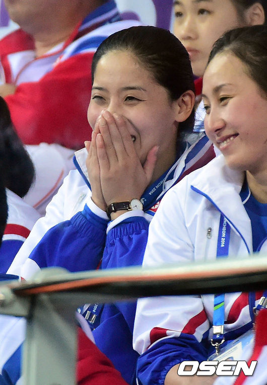 24일 오후 인천 남동체육관에서 열린 2014 인천 아시안게임 기계체조 남자 마루 결승에서 북한 싱크로나이즈 김은아가 미소를 짓고 있다.