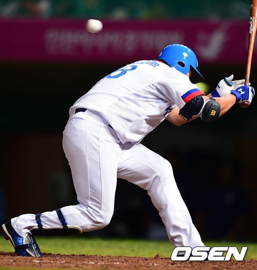 24일 문학야구장에서 벌어진 2014 인천 아시안게임 B조 예선 2차전 한국과 대만의 경기,4회말 선두타자 나성범이 높은 공을 피하고 있다