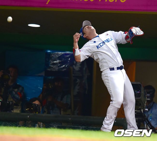 24일 문학야구장에서 벌어진 2014 인천 아시안게임 B조 예선 2차전 한국과 대만의 경기,5회초 1사 대만 주리런의 파울타구를 박병호가 놓치고 있다